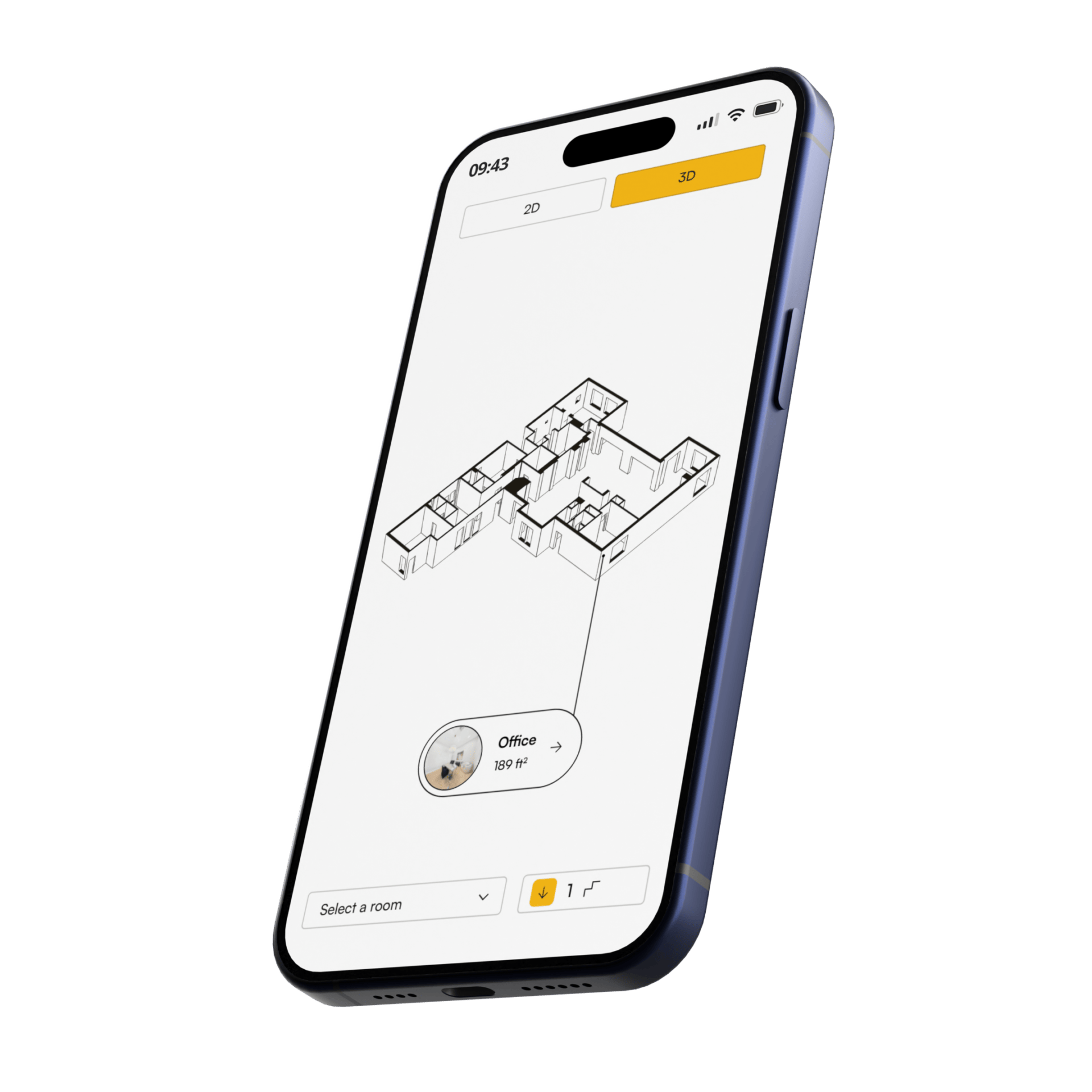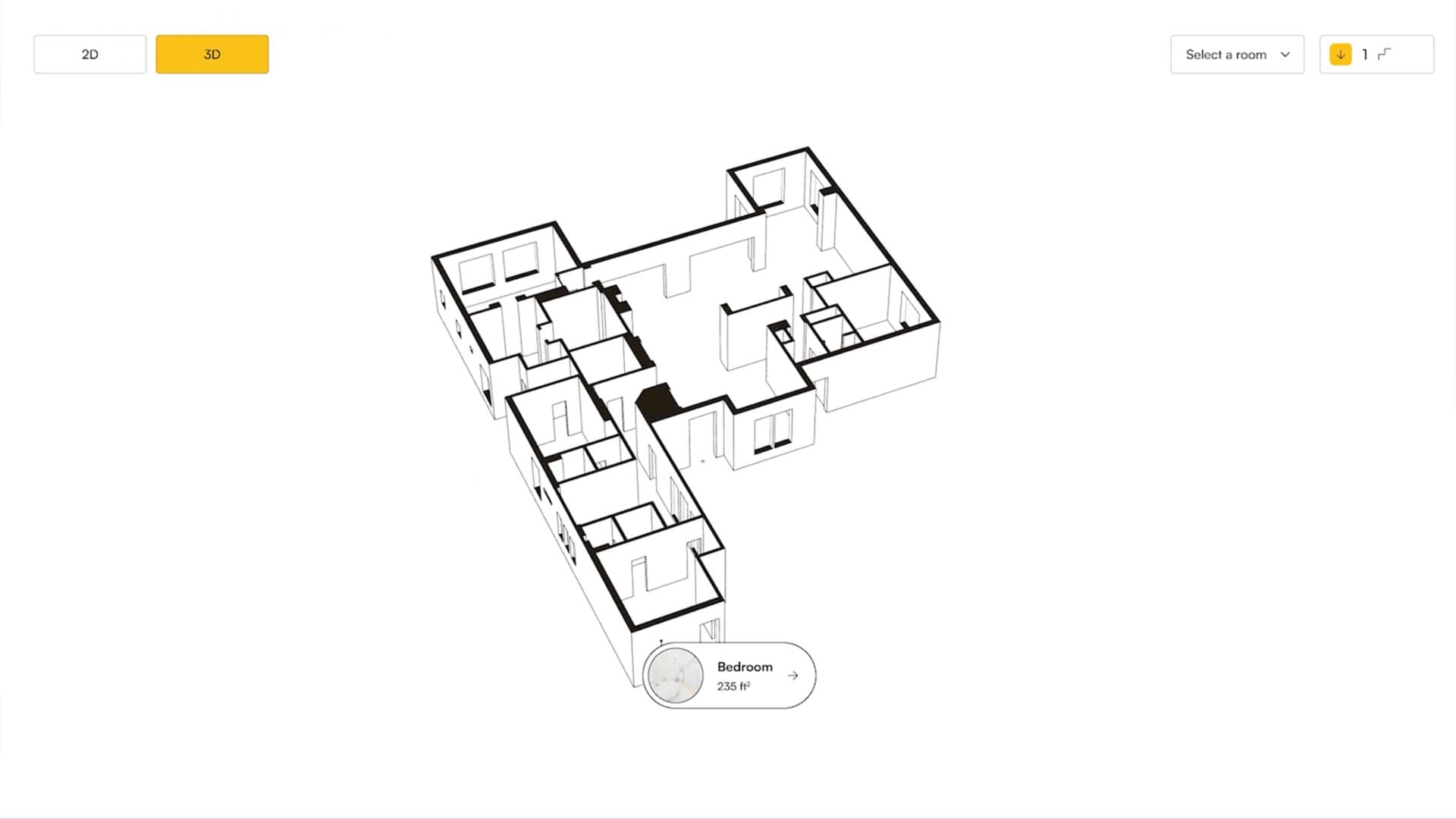 Toggle 2D ↔ 3D, rotate to inspect layout, select rooms and floors, and jump straight into the virtual tour from any room.