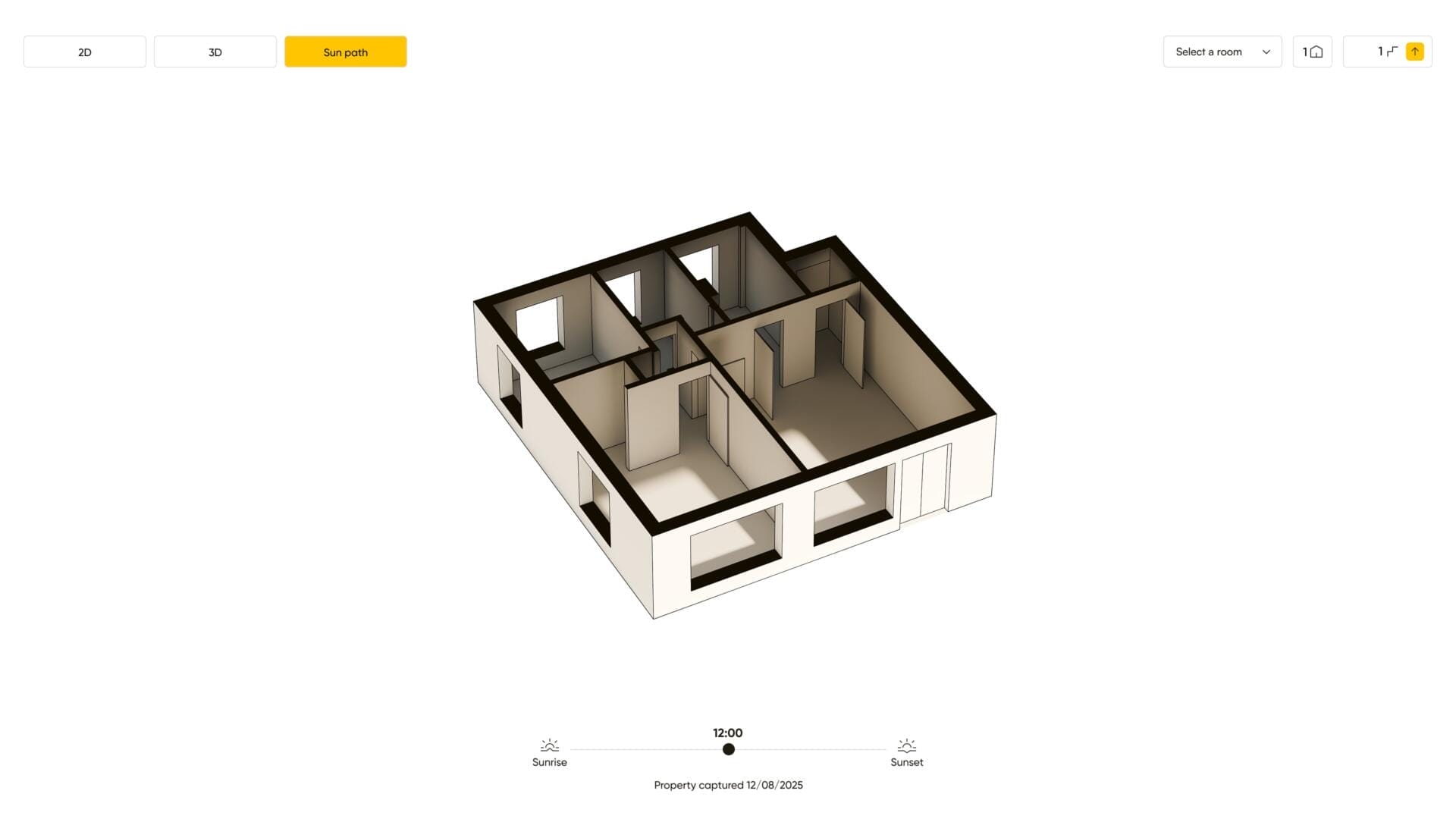 Let buyers see where the sun actually hits. A time-of-day scrubber animates sunlight through rooms, using the property’s geolocation and orientation taken straight from the same scans.